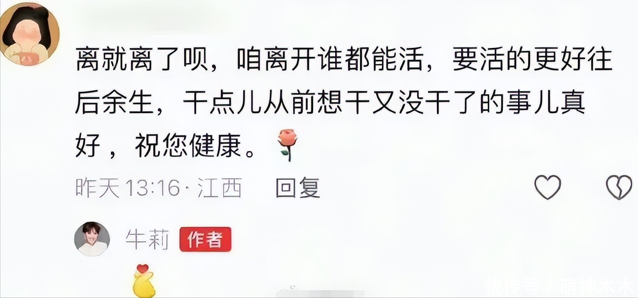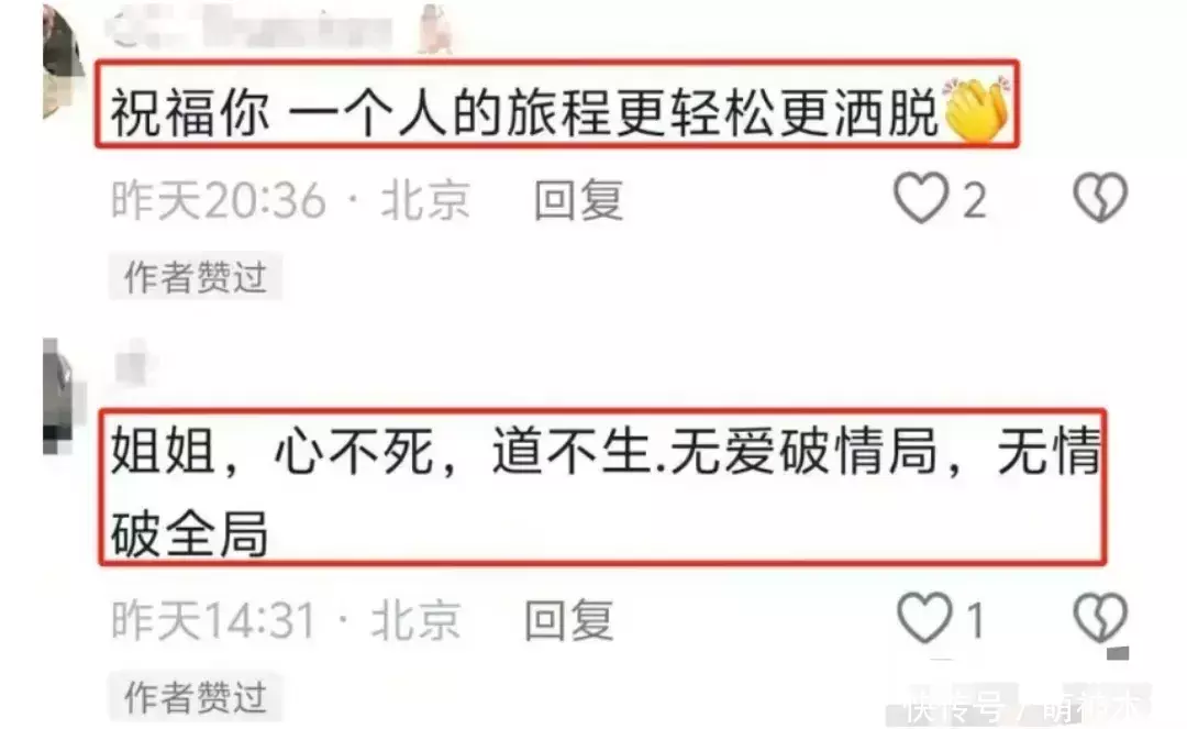 还有类似的评论,比如祝福牛莉“今后一个人的旅程更轻松”、“无爱破情局,无情破全局”,牛莉也都一一点赞回应,看到这一幕,谁都以为牛莉离婚了。